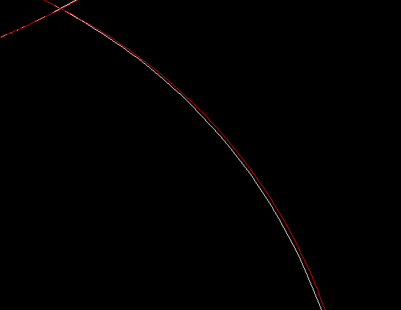 Um das zu vermeiden, wird die Kurve in den äußersten Radienbereichen etwas zurückgenommen. Diese Profilrücknahme besteht selbst aus tangentialen Übergängen. Im folgenden Bild ist die theoretische Kurvenflanke weiß und die zurückgenommene rot dargestellt. Die Profilrücknahme haben wir hier stark übertrieben, damit man den Effekt noch sehen kann.